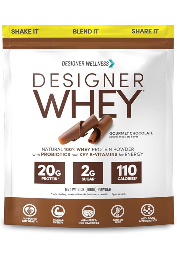 Amazon Com Designer Wellness Designer Whey Natural 100 Whey Protein Powder With Probiotics Fiber And Key B Vitamins For Energy Gluten Free Non Gmo Gourmet Chocolate 12 Oz Sports Nutrition Whey Protein Powders